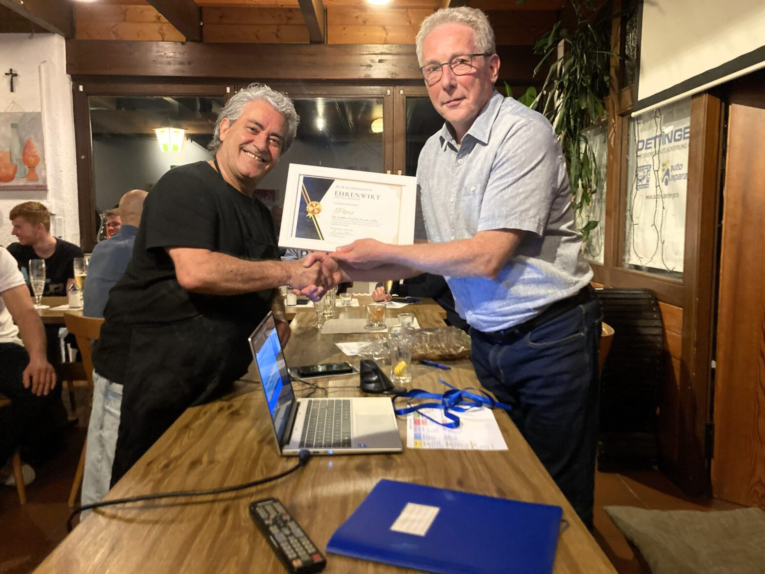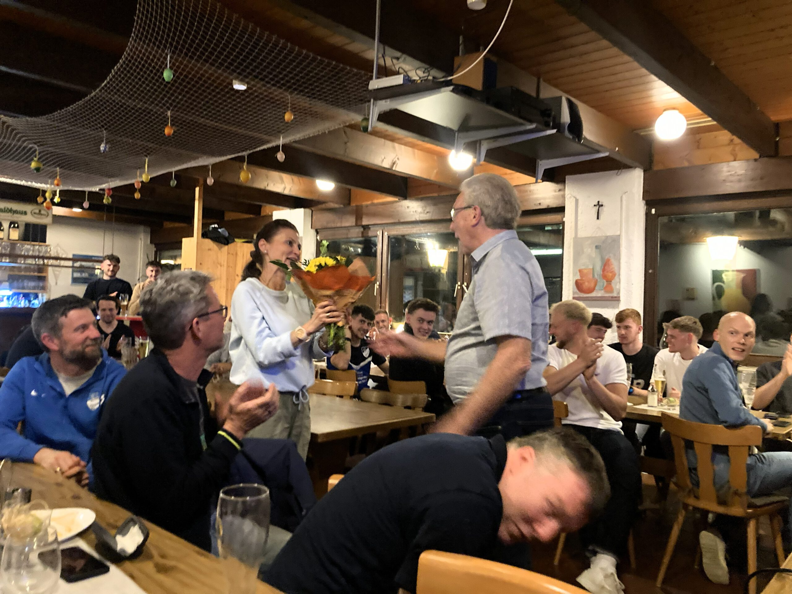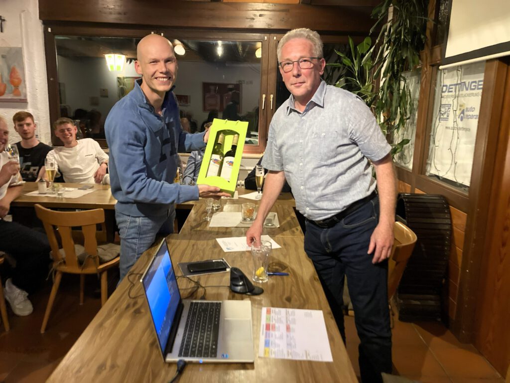 In den einzelnen Tätigkeitsberichten informierten verschiedene Referenten über die Aktivitäten der jeweiligen Abteilungen oder Mannschaften. Kassierer Sven Dorst hielt den Kassenbericht, auf den die Entlastung der Gesamtvorstandschaft folgte. Die Neuwahlen brachten kleine, aber durchwegs positive, Überraschungen. So erklärte sich Kassenprüfer Marian Lotze bereit, für ein weiteres Jahr dieses Amt auszuüben. Weiterhin sollte der durch das Ausscheiden von Nicolai Heitz frei gewordene Beisitzer- Posten nicht neu besetzt werden. Auf die Frage der Wahlleiterin Petra Zimmermann, ob es Vorschläge aus der Versammlung für die Neubesetzung dieses Postens gab, meldete sich Max Wehmeyer und wurde anschließend von der Versammlung einstimmig zum neuen Beisitzer gewählt. Am Ende der Versammlung, unter dem Punkt Verschiedenes, gab es noch eine Überraschung für Clubheim-Wirt Piero und seine Frau Doro. Am 1. April diesen Jahres feierten die Wirtsleute ihr 10-jähriges Wirte-Jubiläum im Waltershofener Clubheim. Deshalb wurde Piero die Urkunde zum „Ehrenwirt“ sowie ein besonderes Präsent, nämlich ein Servierbrett mit Vereinsgravur inkl. 10 Schnapsgläsern, überreicht. Seine Frau Doro erhielt einen Blumenstrauß, über den sie sich, sichtlich überrascht, sehr freute. Marian Lotze, der eigentlich aus dem Amt des Kassenprüfers ausscheiden wollte, wurde sodann noch für 10 Jahre als Kassenprüfer geehrt.