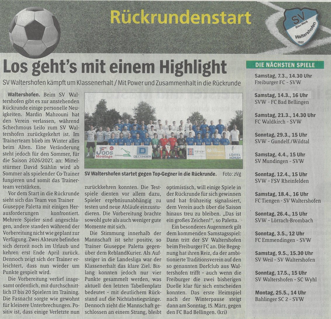 Das Spiel gegen den FC Bad Bellingen, welches im letzten Satz erwähnt wird, wird auf Samstag, den 14.03. vorverlegt.